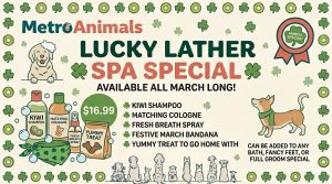 The Lucky Lather Spa Special runs all through March 2026 at all four locations. Call or stop by your nearest Metro Animals to add it to your dog’s next grooming appointment.